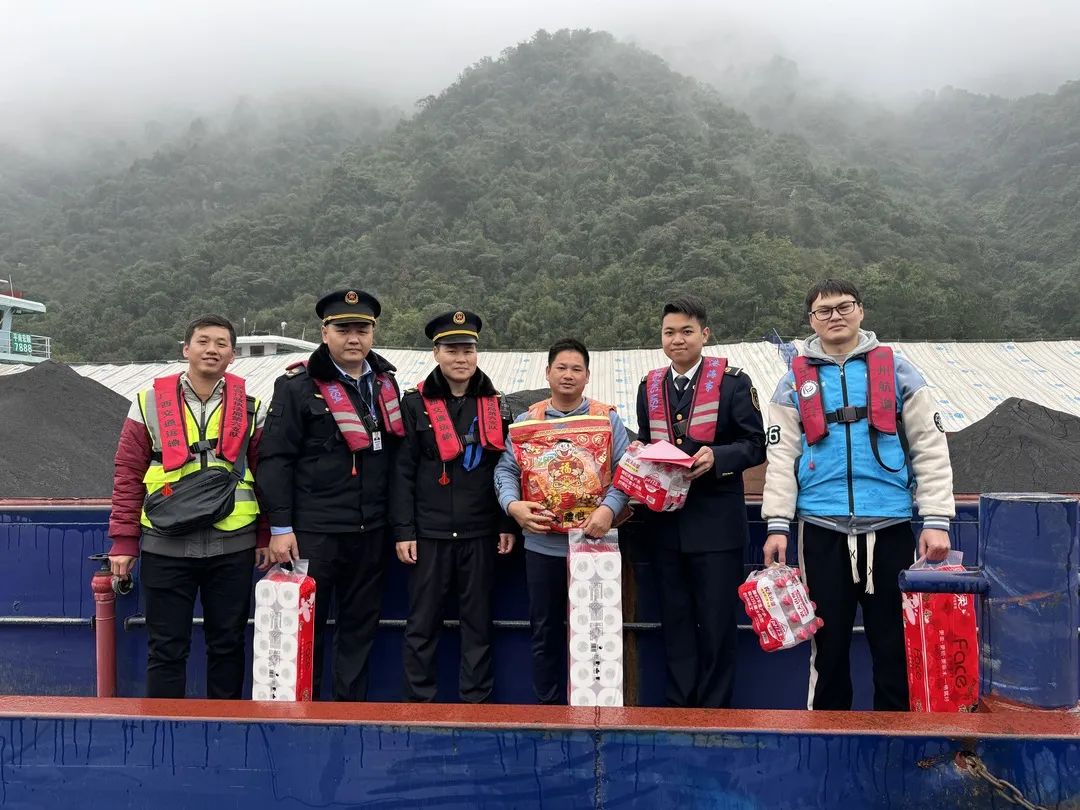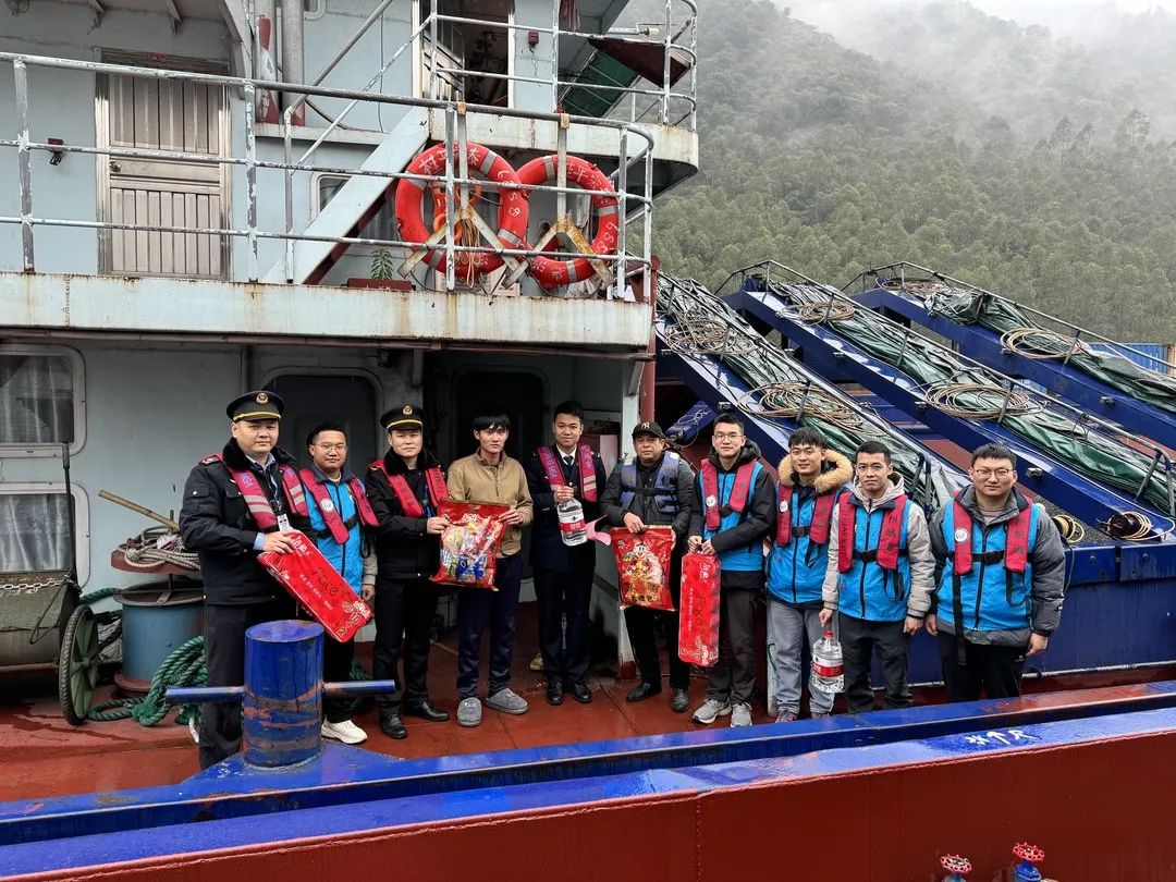 2月5日,柳州航道养护中心联合自治区交通运输综合行政执法局第三支队、第六支队、贵港海事局桂平海事处、大藤峡水利枢纽船闸管理中心到桂平市大藤峡船闸上游船舶锚泊水域联合开展以“情满旅途归家路·交通青年在行动”为主题的春节志愿服务活动,服务黔江水上春运安全,助力船民平安返乡。