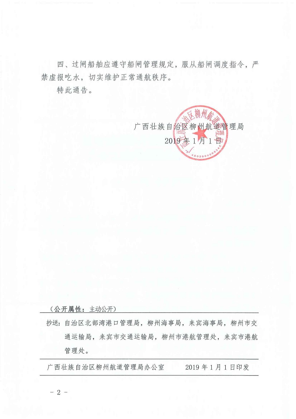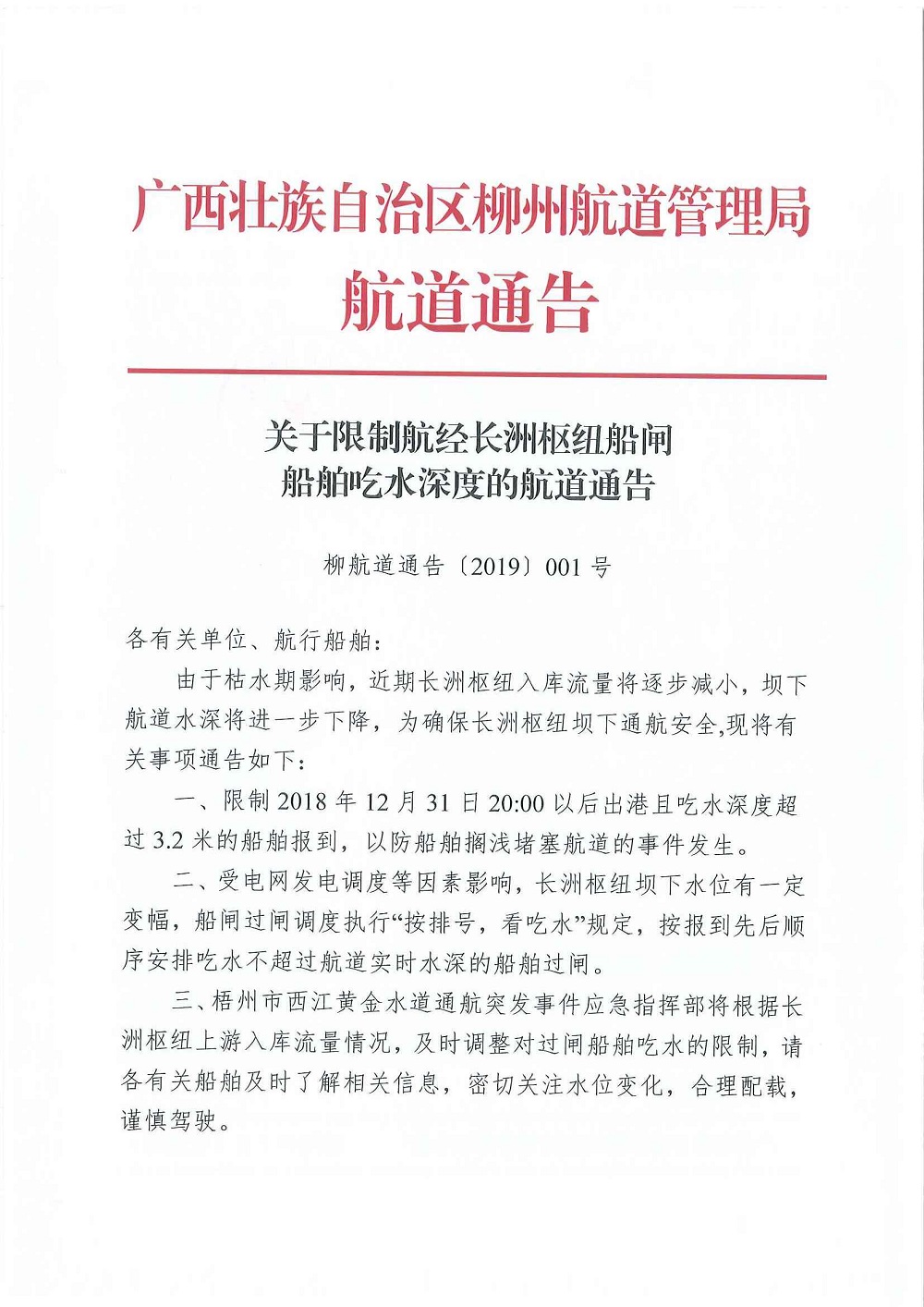 关于限制航经长洲枢纽船闸船舶吃水深度的航道通告