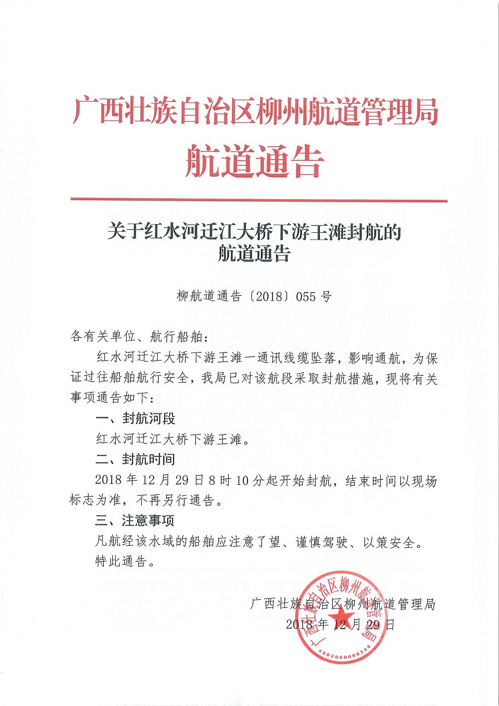关于红水河迁江大桥下游王滩封航的航道通告