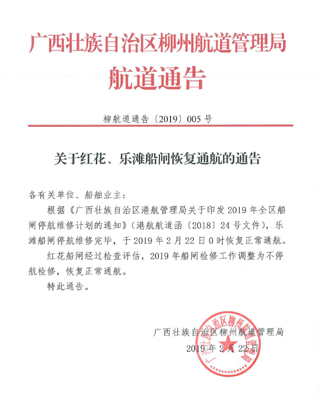关于红花、乐滩船闸恢复通航的通告