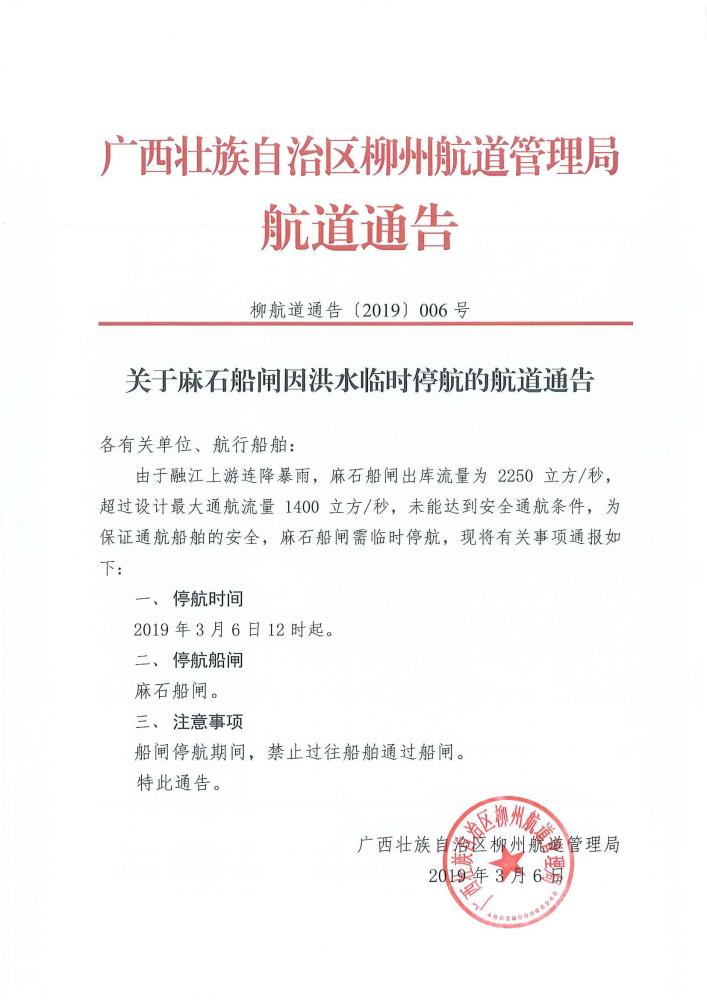 关于麻石船闸洪水停航通告