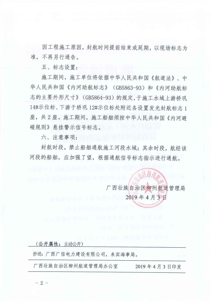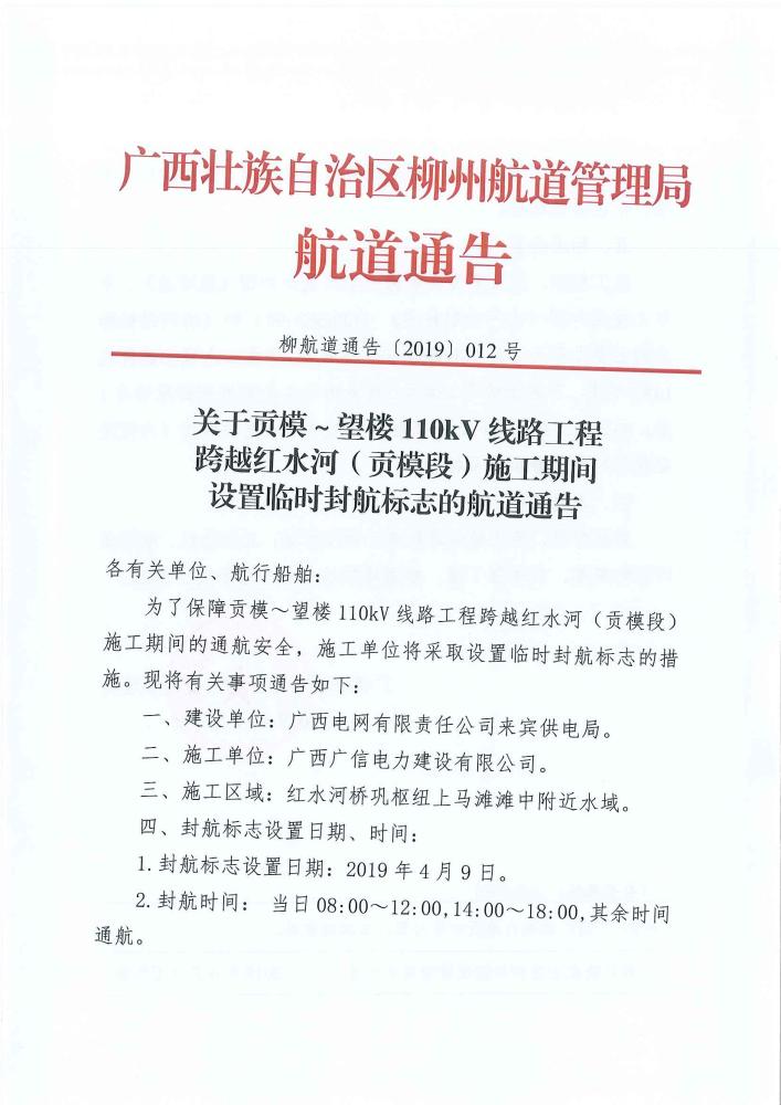 关于贡?!?10kV线路工程跨越红水河(贡模段)施工期间航道封航的航道通告