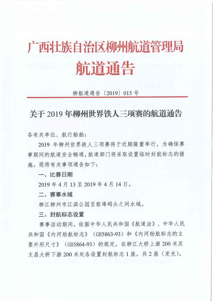 关于2019年柳州世界铁人三项赛的航道通告