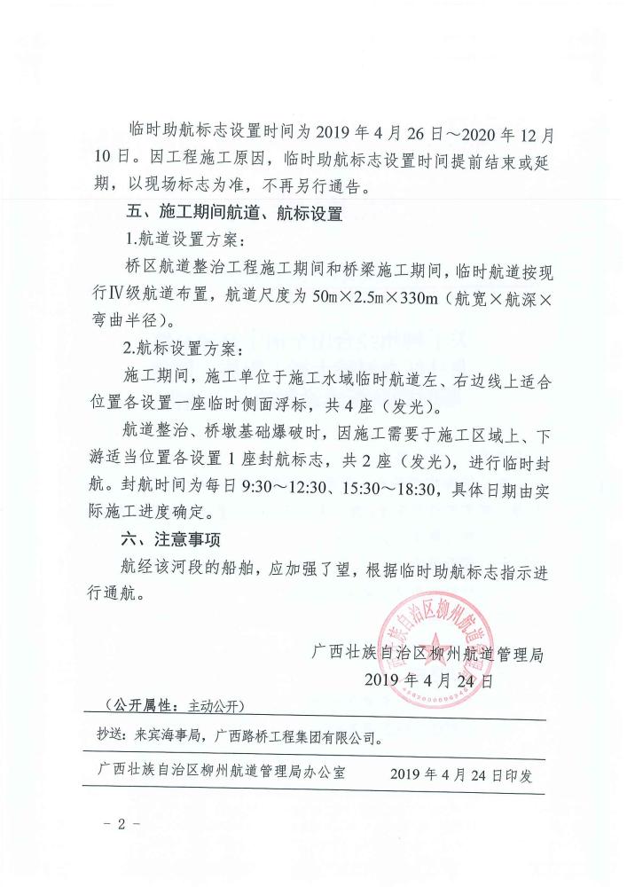 关于柳州经合山至南宁高速公路龙马红水河特大桥工程施工期间临时助航标志设置的航道通告
