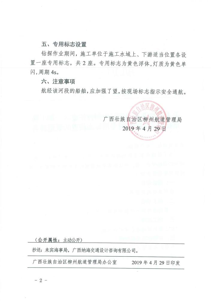 关于来宾港象州港区中间村作业区一期工程钻探施工期间临时专用标志设置的航道通告