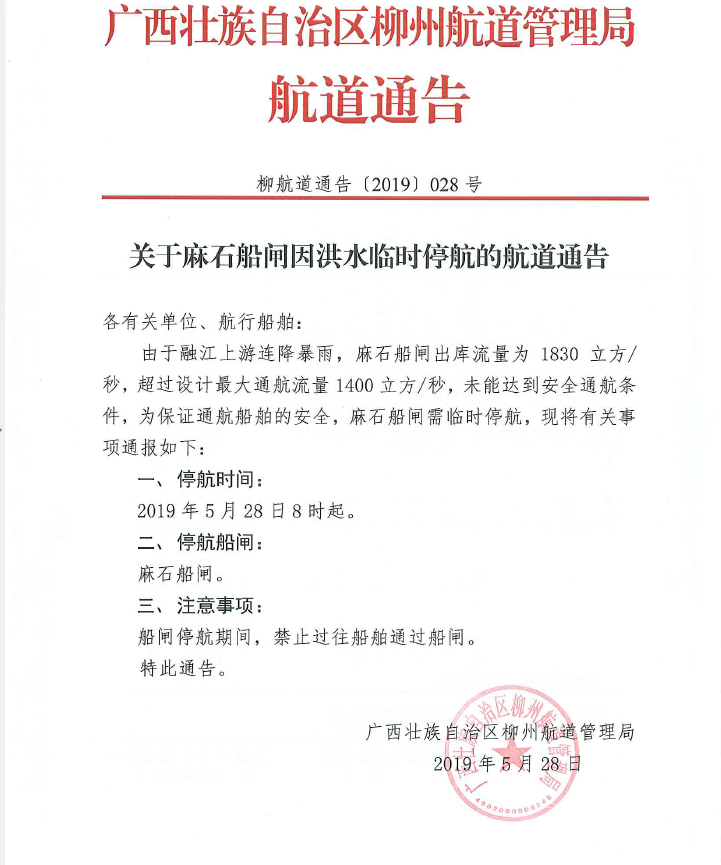 关于麻石船闸因洪水临时停航的航道通告