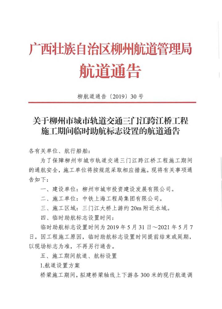 关于柳州市城市轨道交通三门江跨江桥工程施工期间临时助航标志设置的航道通告