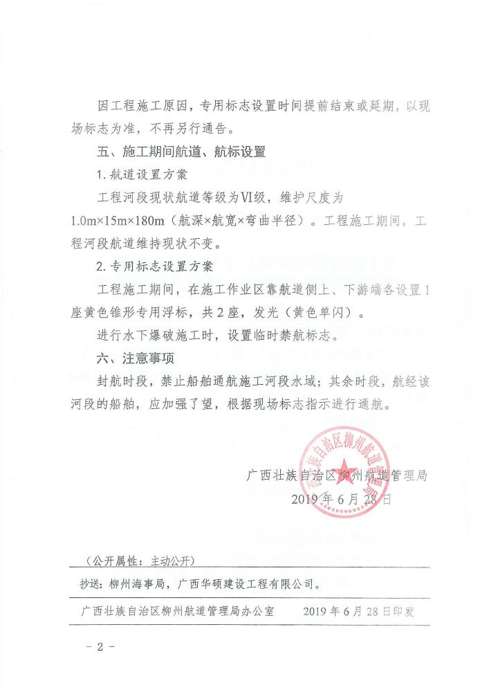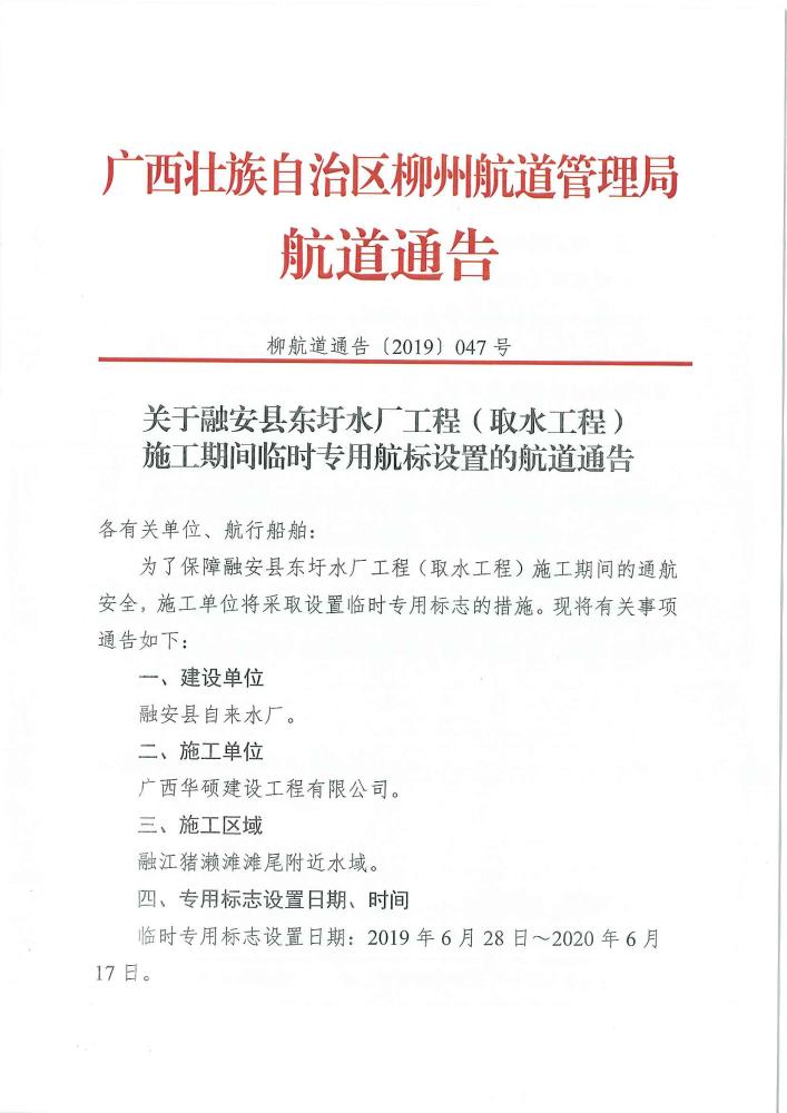 关于融安县东圩水厂工程(取水工程)施工期间临时专用航标设置的航道通告