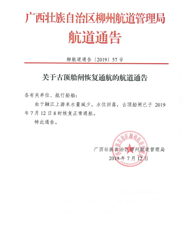 关于古顶船闸恢复通航的通告