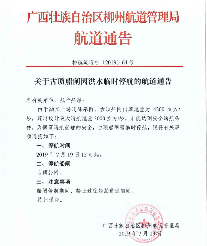 关于古顶船闸因洪水临时停航的航道通告