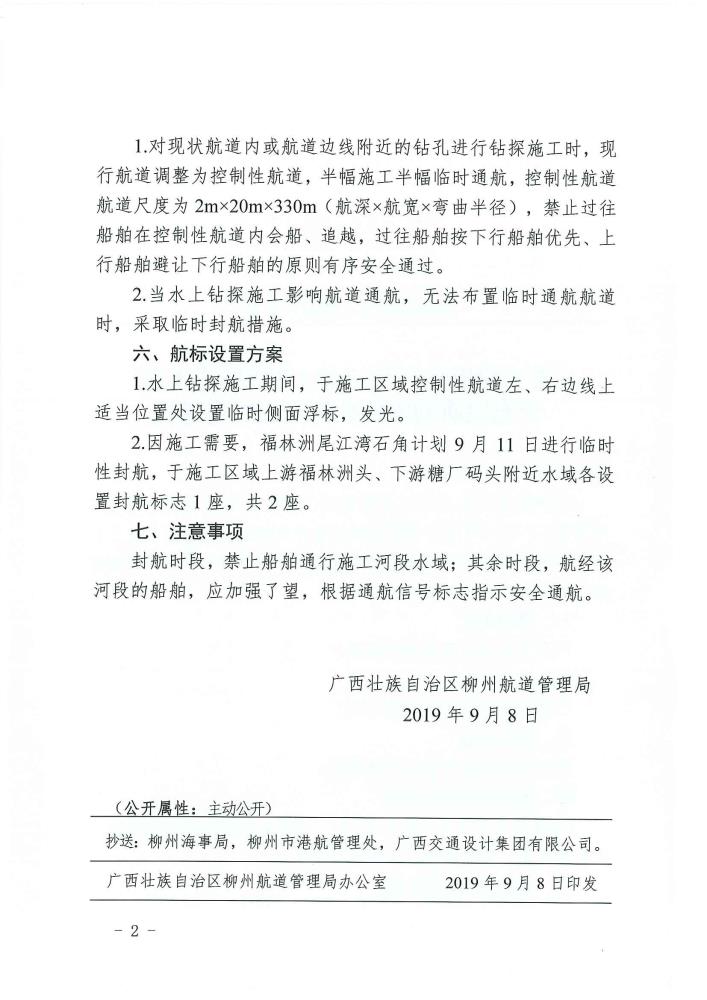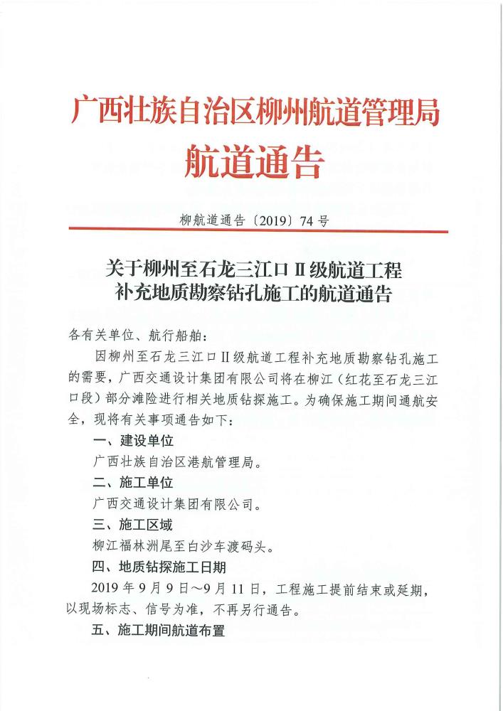 柳江红花至石龙三江口200吨级航道工程钻探施工的航道通告