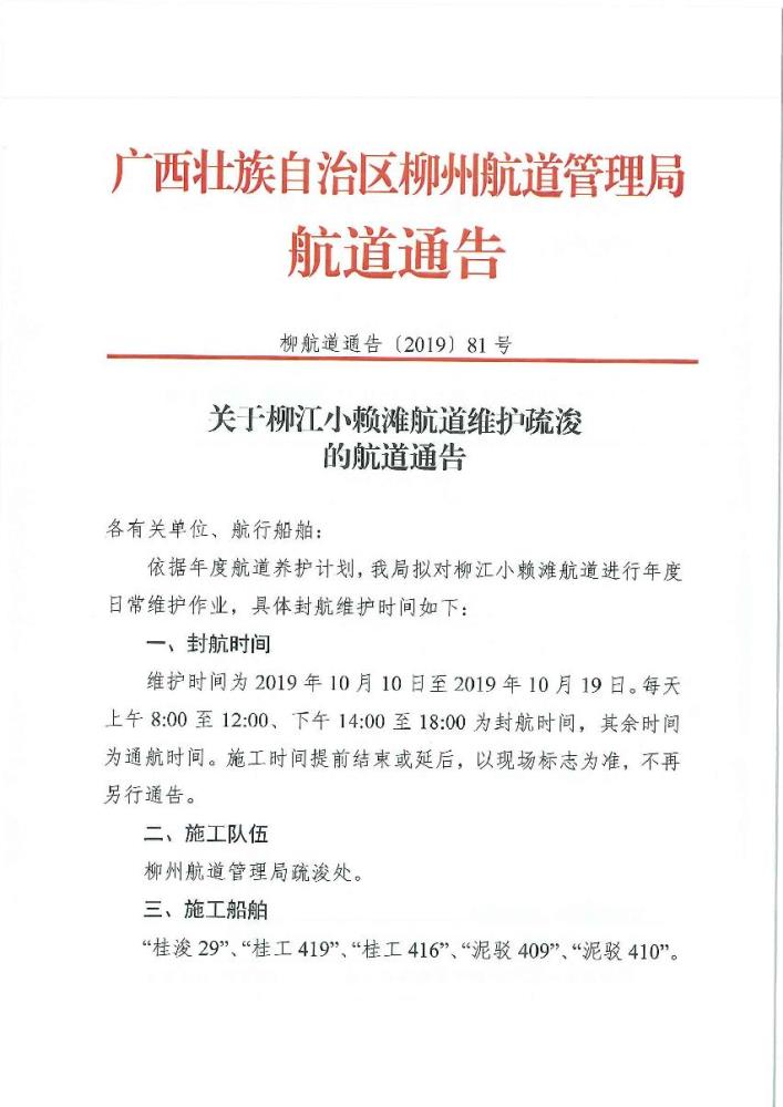 关于柳江小赖滩航道维护疏浚的航道通告