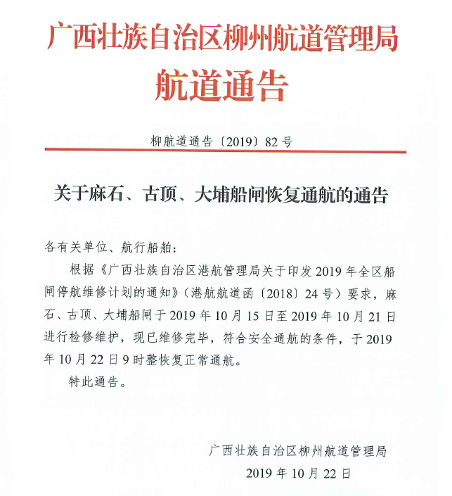 关于麻石、古顶、大埔船闸恢复通航的通告