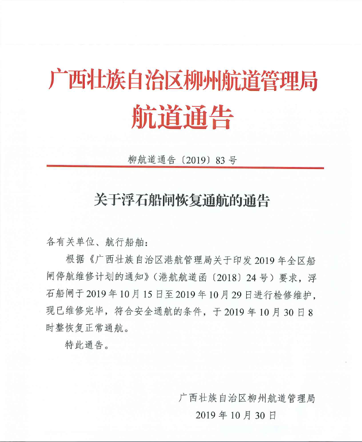 关于浮石船闸恢复通航的通告