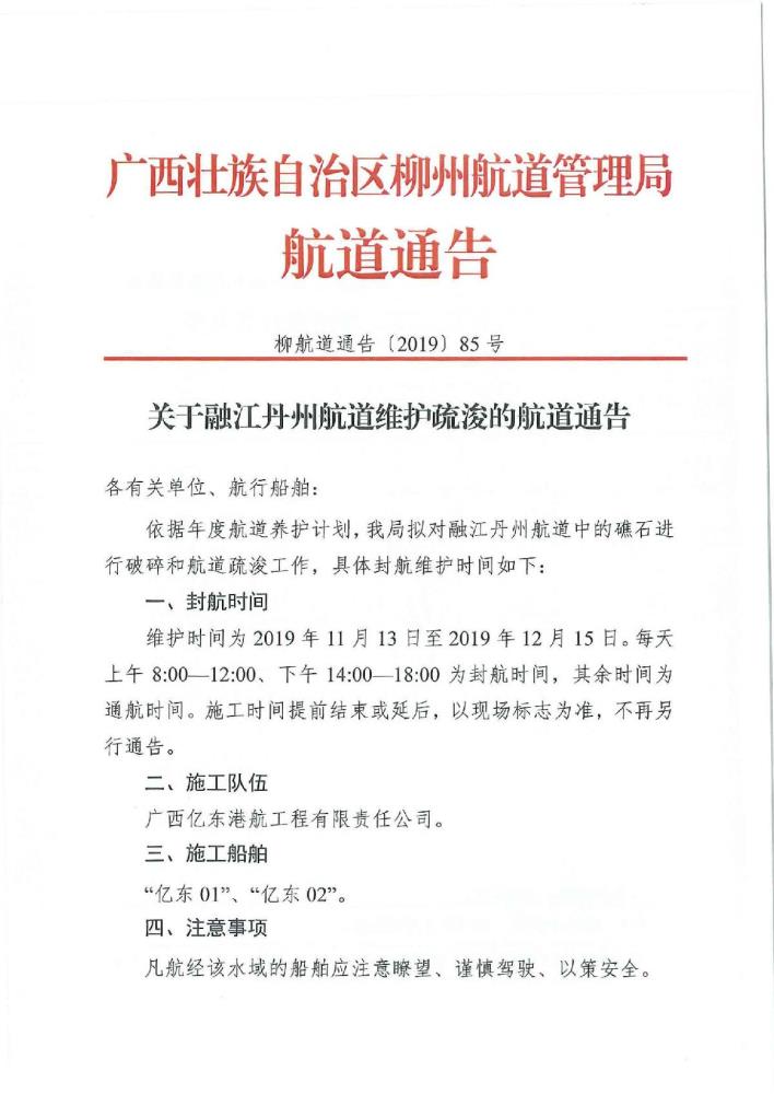 关于融江丹州航道维护疏浚的航道通告
