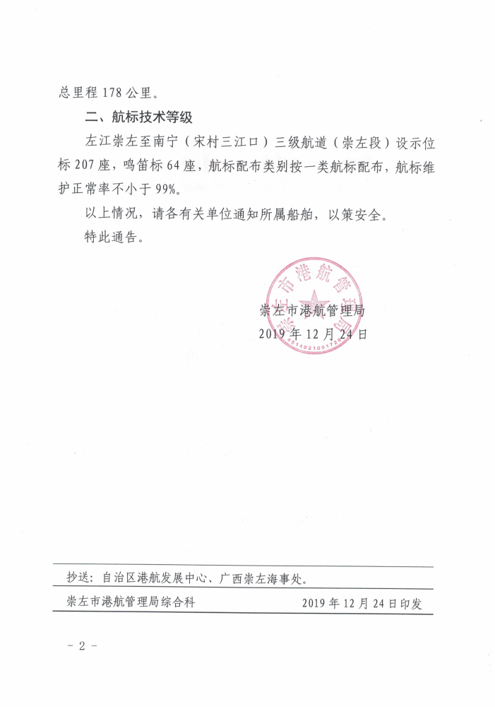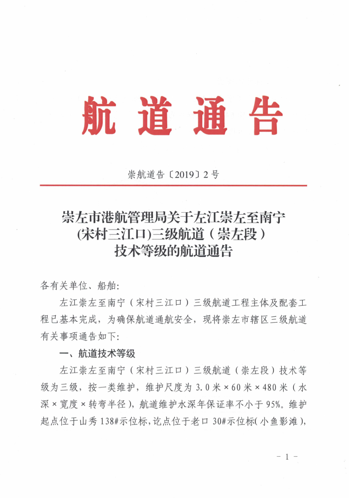 崇左市港航管理局关于左江崇左至南宁(宋村三江口)三级航道(崇左段)技术等级的航道通告