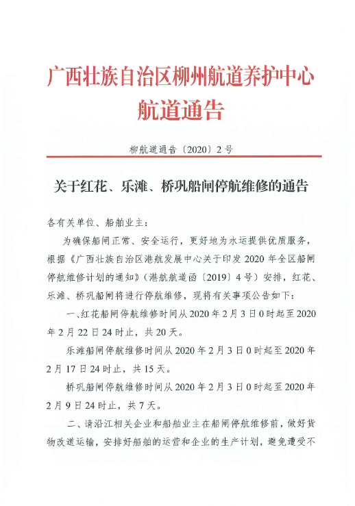关于红花、乐滩、桥巩船闸停航维修的通告