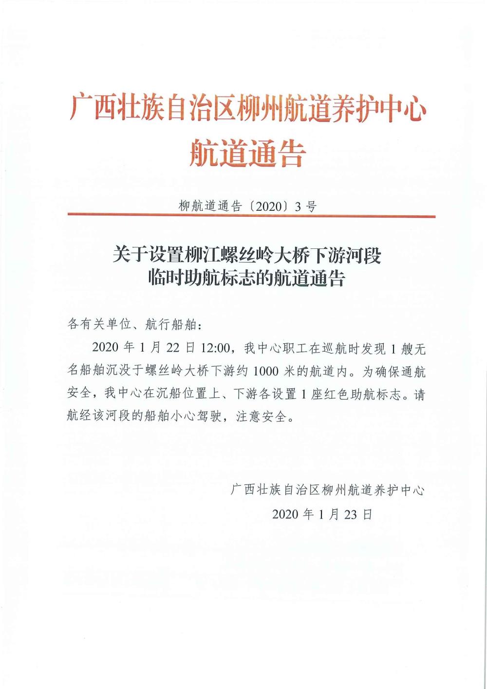 关于设置柳江螺丝岭大桥下游河段临时助航标志的航道通告