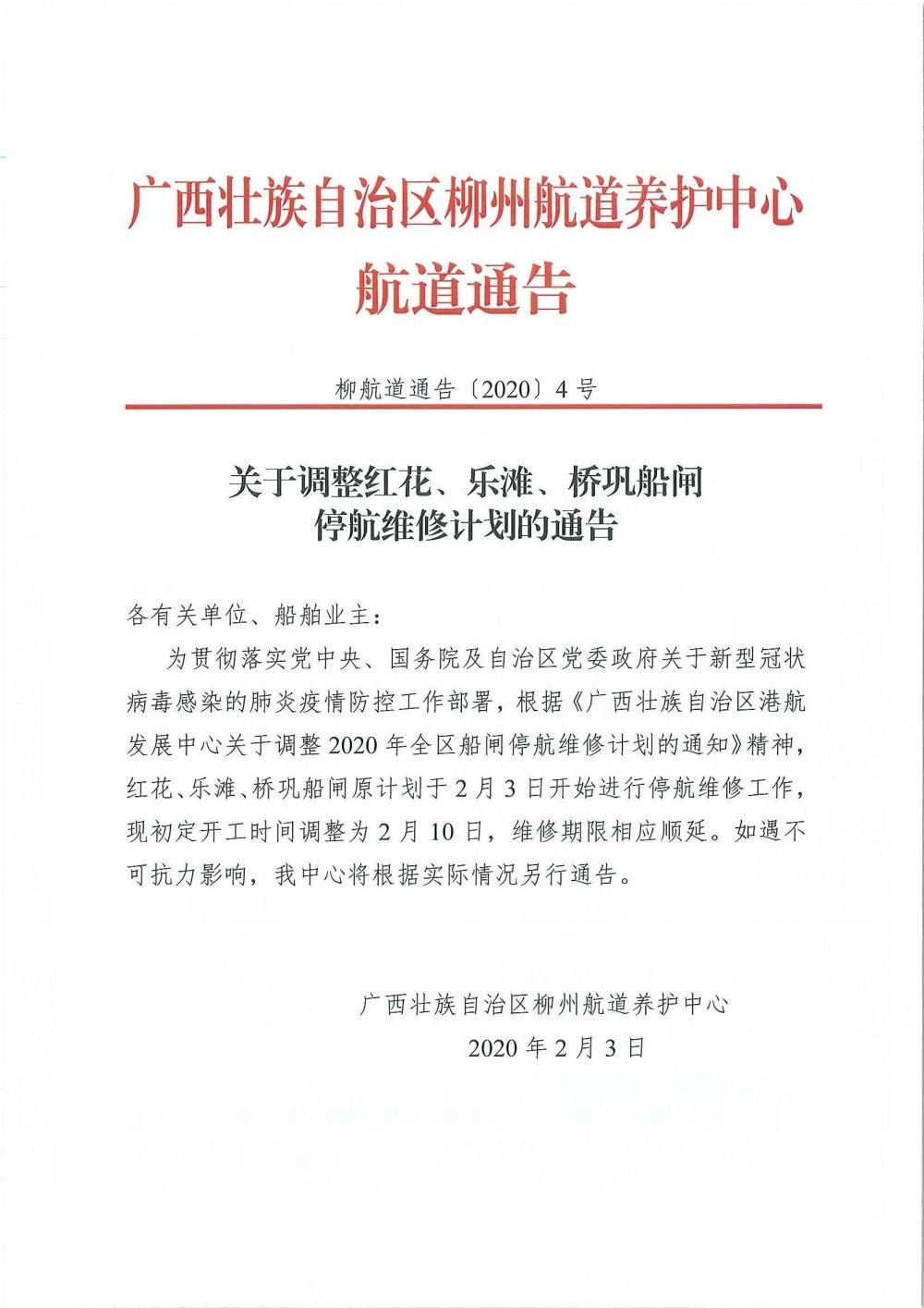 关于调整红花、乐滩、桥巩船闸停航维修计划的通告