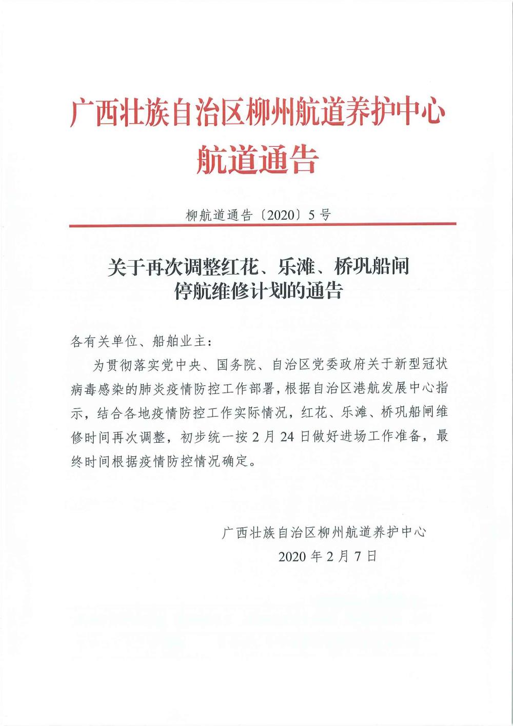 关于再次调整红花、乐滩、桥巩船闸停航维修计划的通告