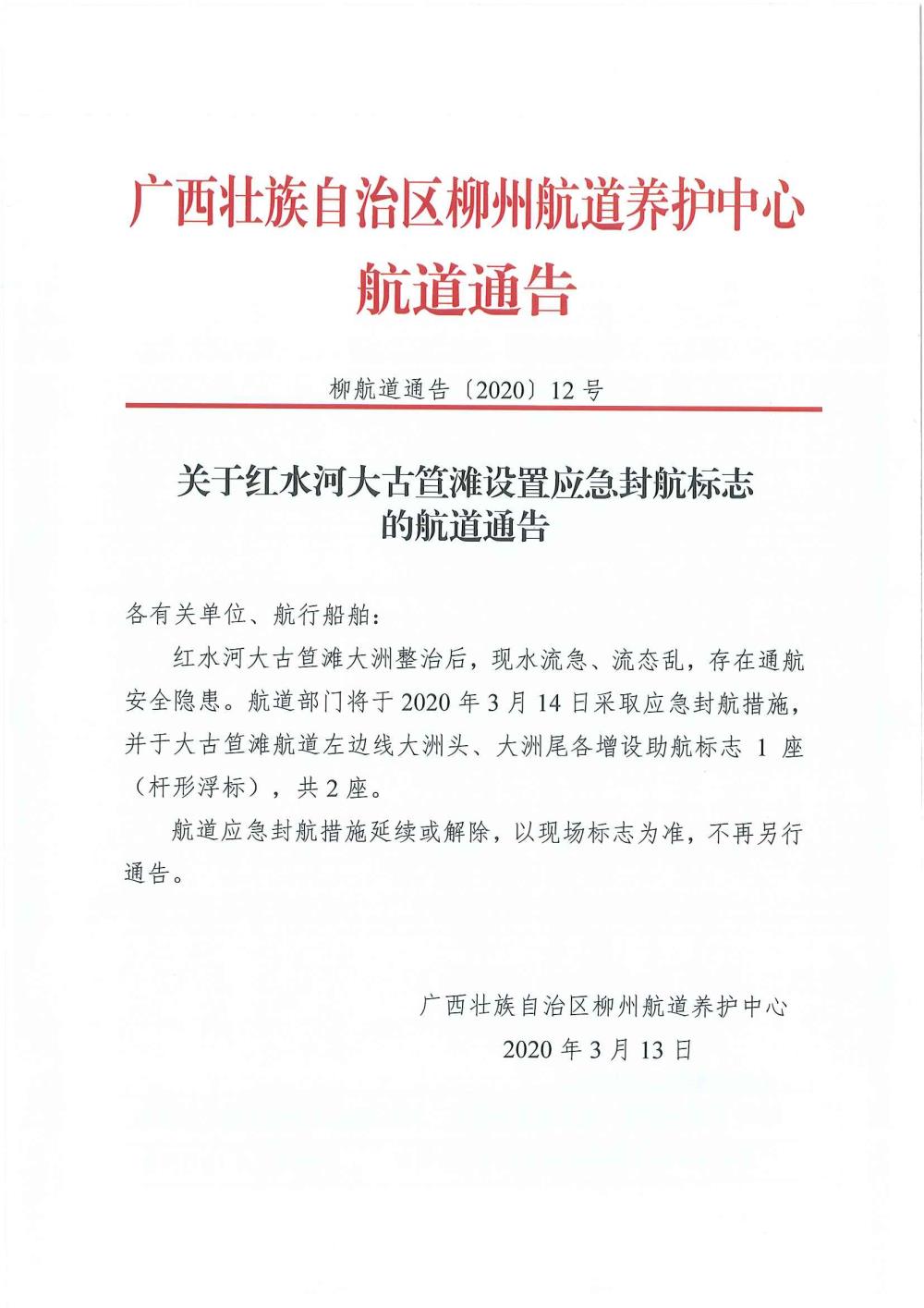 关于红水河大古笪滩应急封航的通告