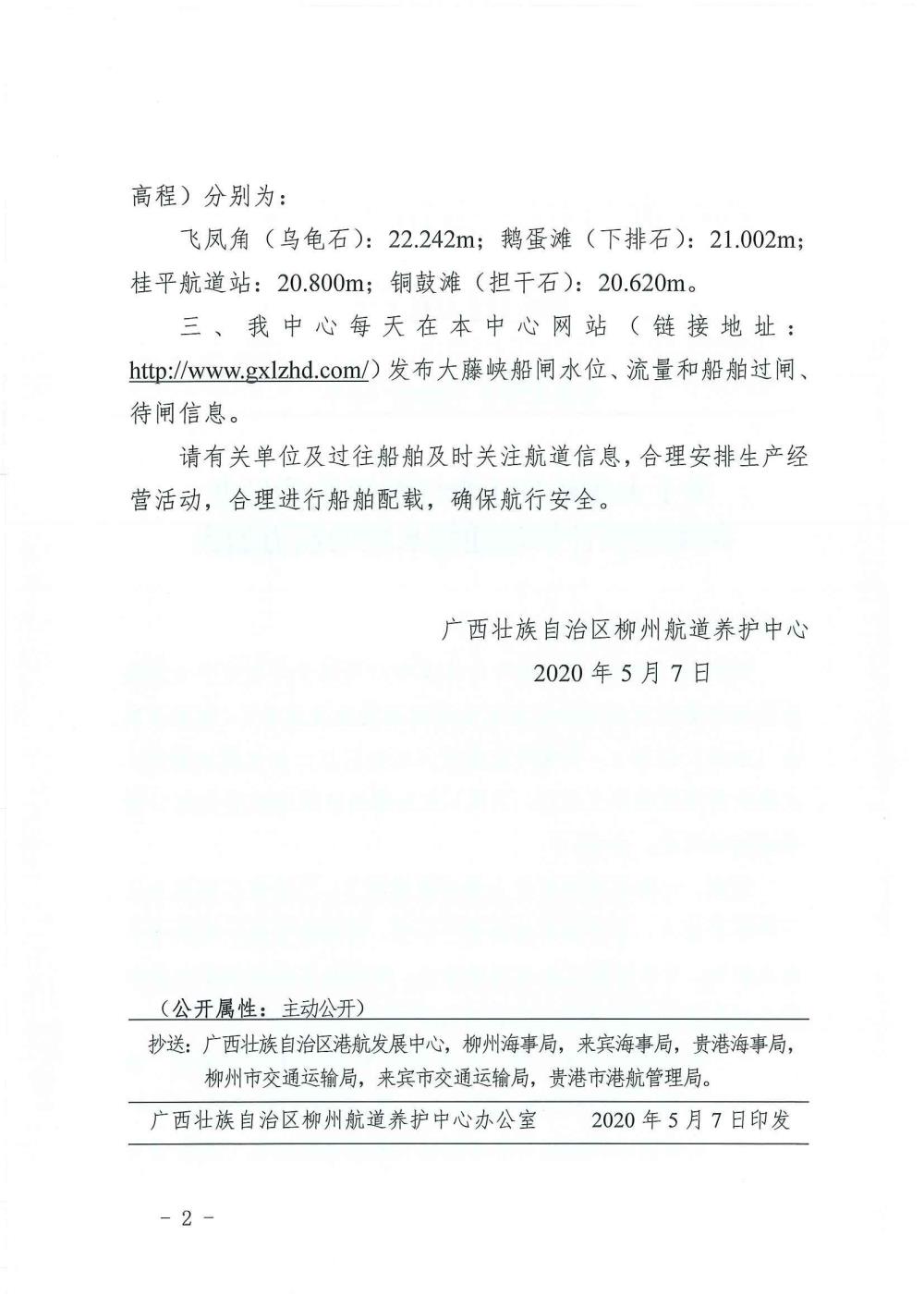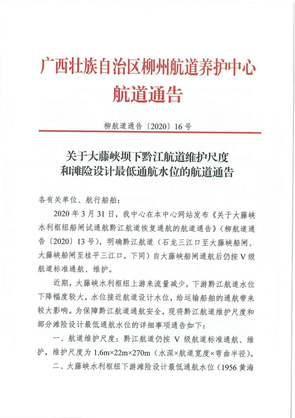 关于大藤峡坝下黔江航道维护尺度和滩险设计最低通航水位的航道通告