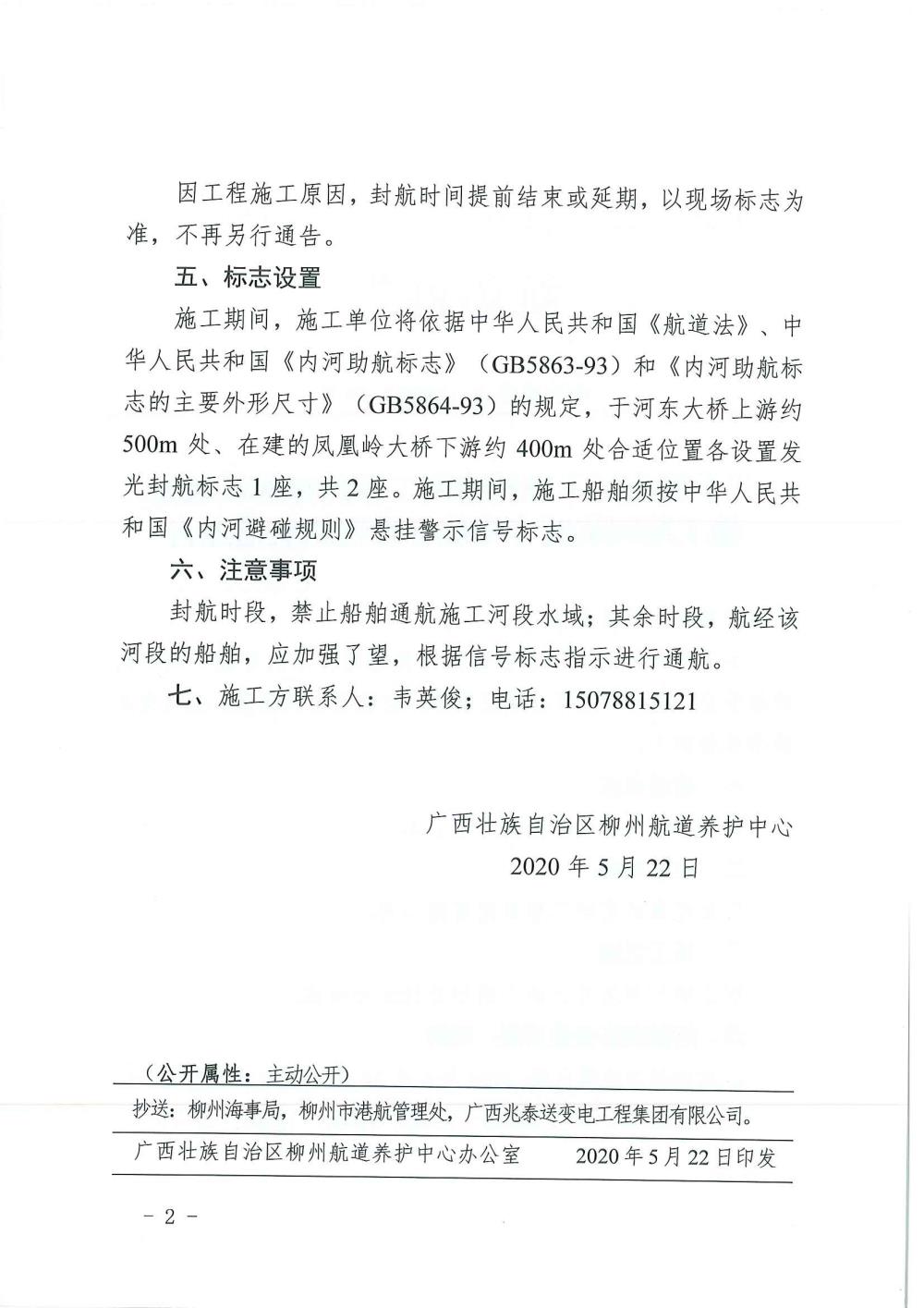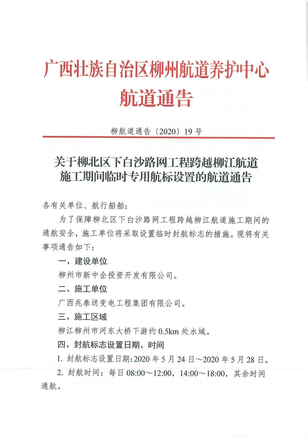关于柳北区下白沙路网工程跨越柳江航道施工期间临时专用航标设置的航道通告