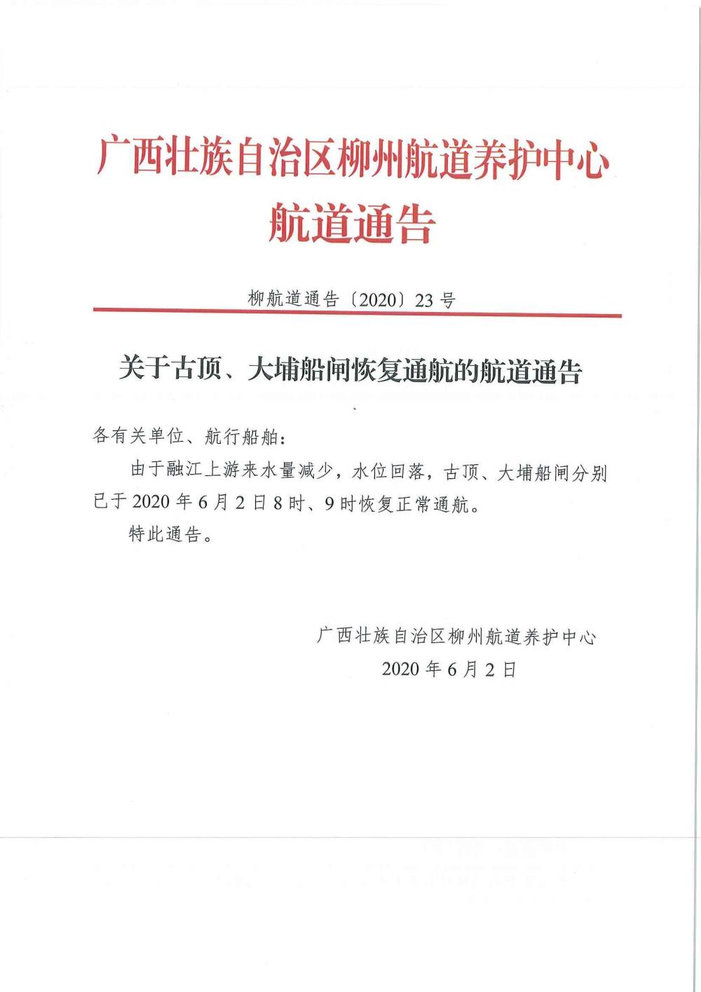 关于古顶、大埔船闸恢复通航的航道通告