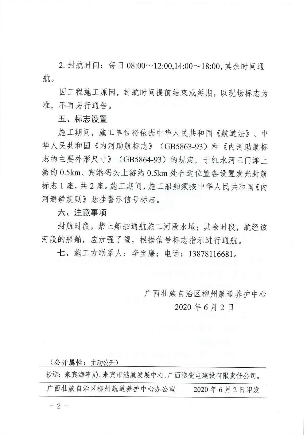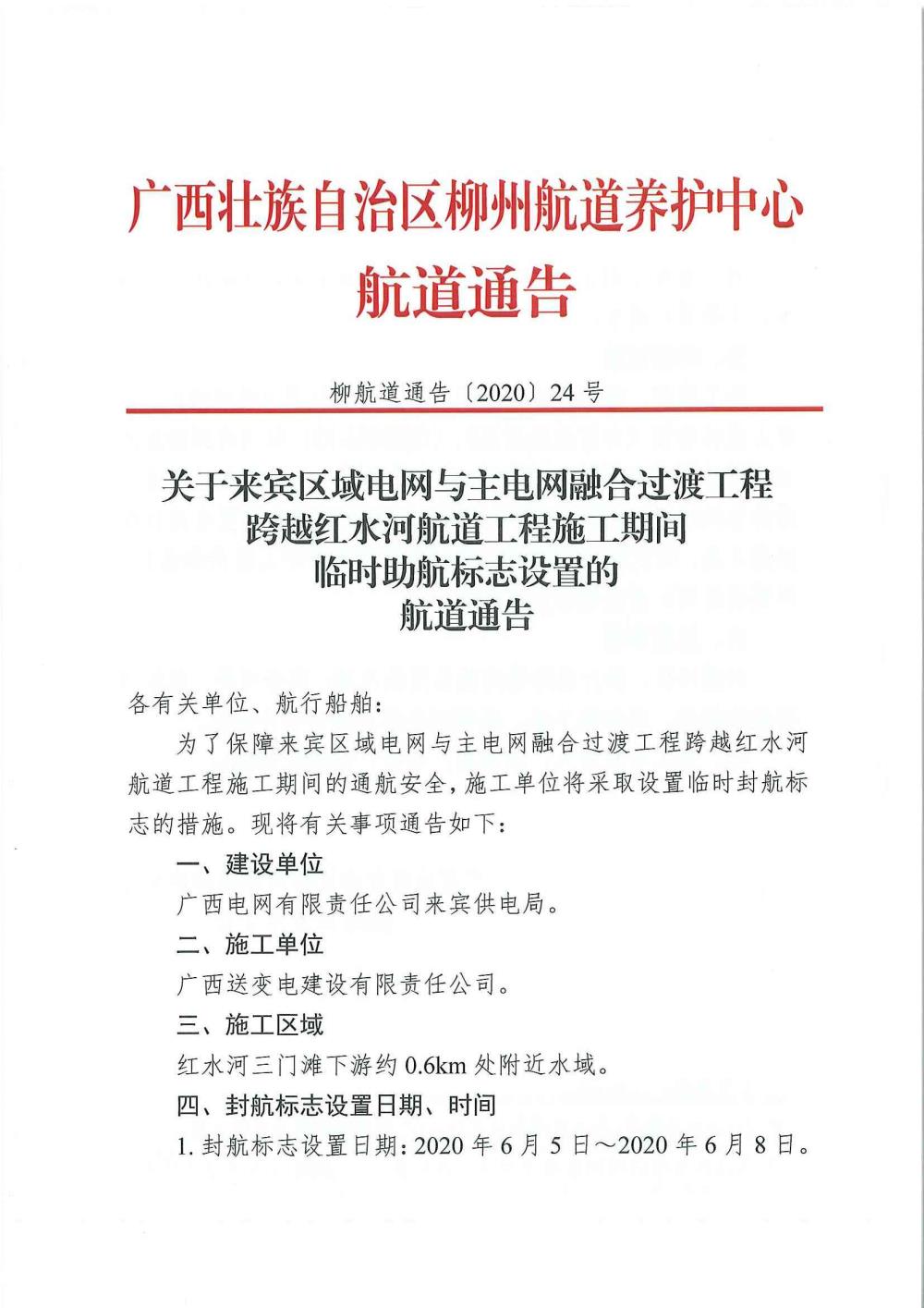 关于来宾区域电网与主电网融合过渡工程跨越红水河航道工程施工期间临时助航标志设置的 航道通告