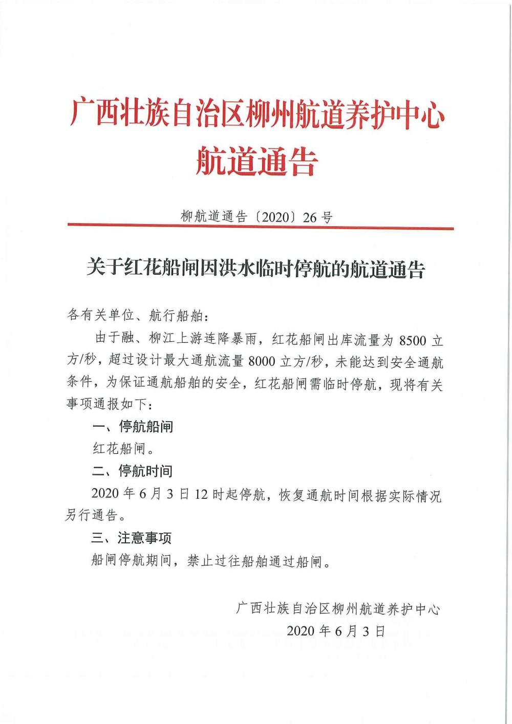 关于红花船闸因洪水临时停航的航道通告