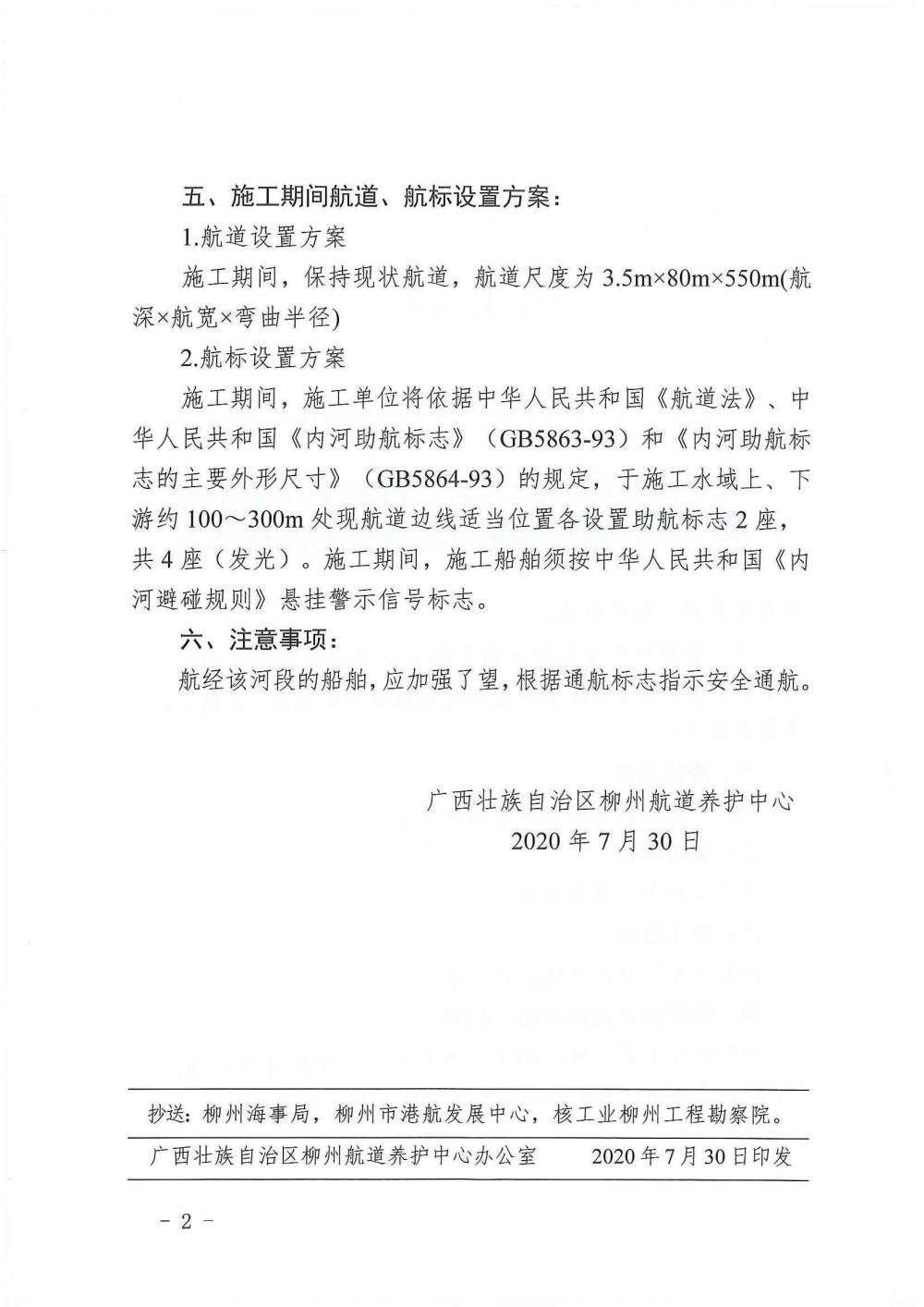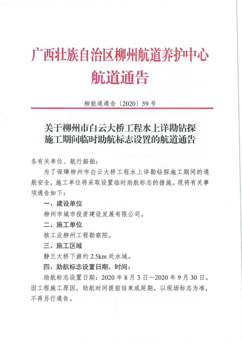 关于柳州市白云大桥工程水上详勘钻探施工期间临时助航标志设置的航道通告