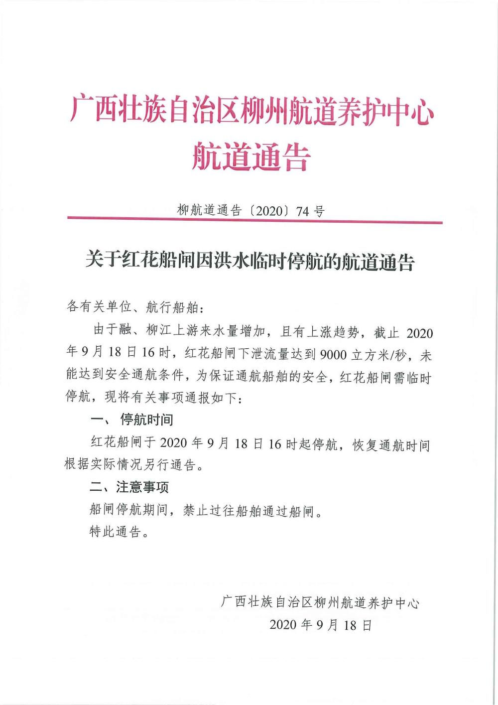 关于红花船闸因洪水临时停航的航道通告