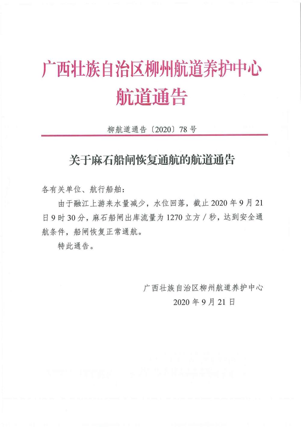关于麻石船闸恢复通航的航道通告