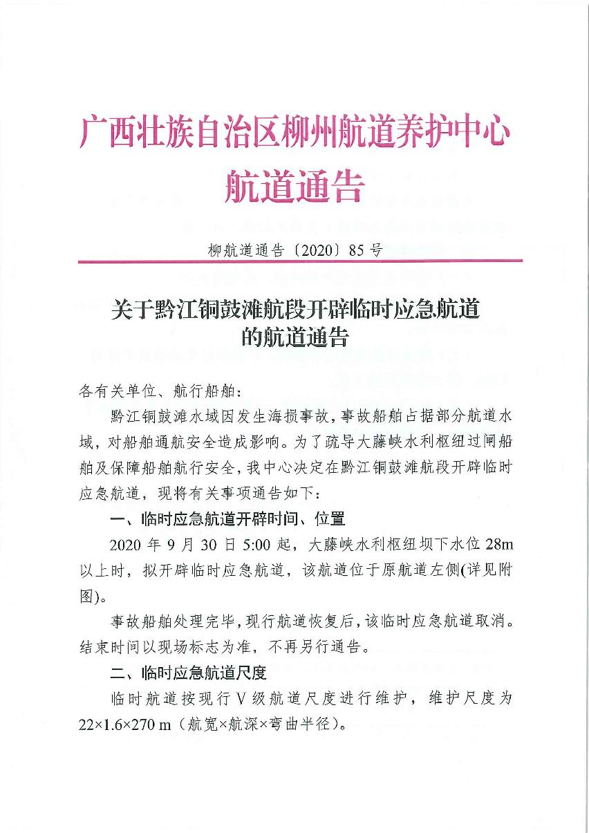 关于黔江铜鼓滩航段开辟临时应急航道的航道通告