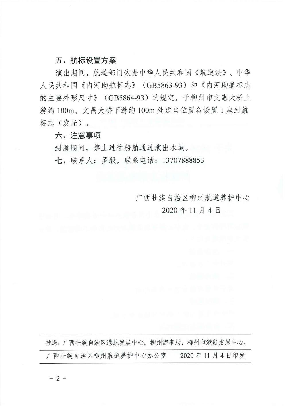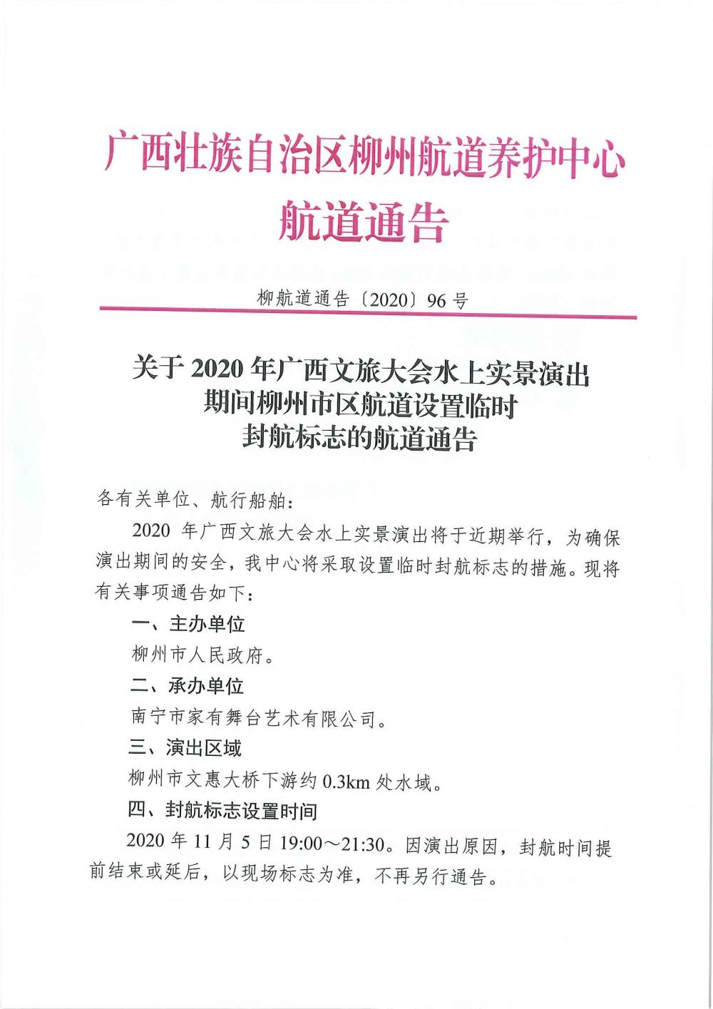 关于2020年广西旅发大会水上实景演出柳州市区航道设置封航标志的航道通告