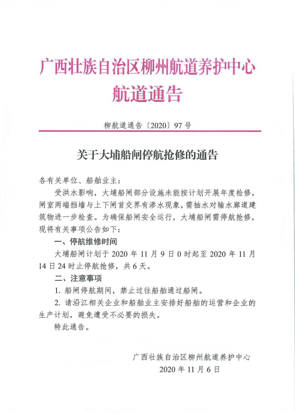 关于大埔船闸停航抢修的通告