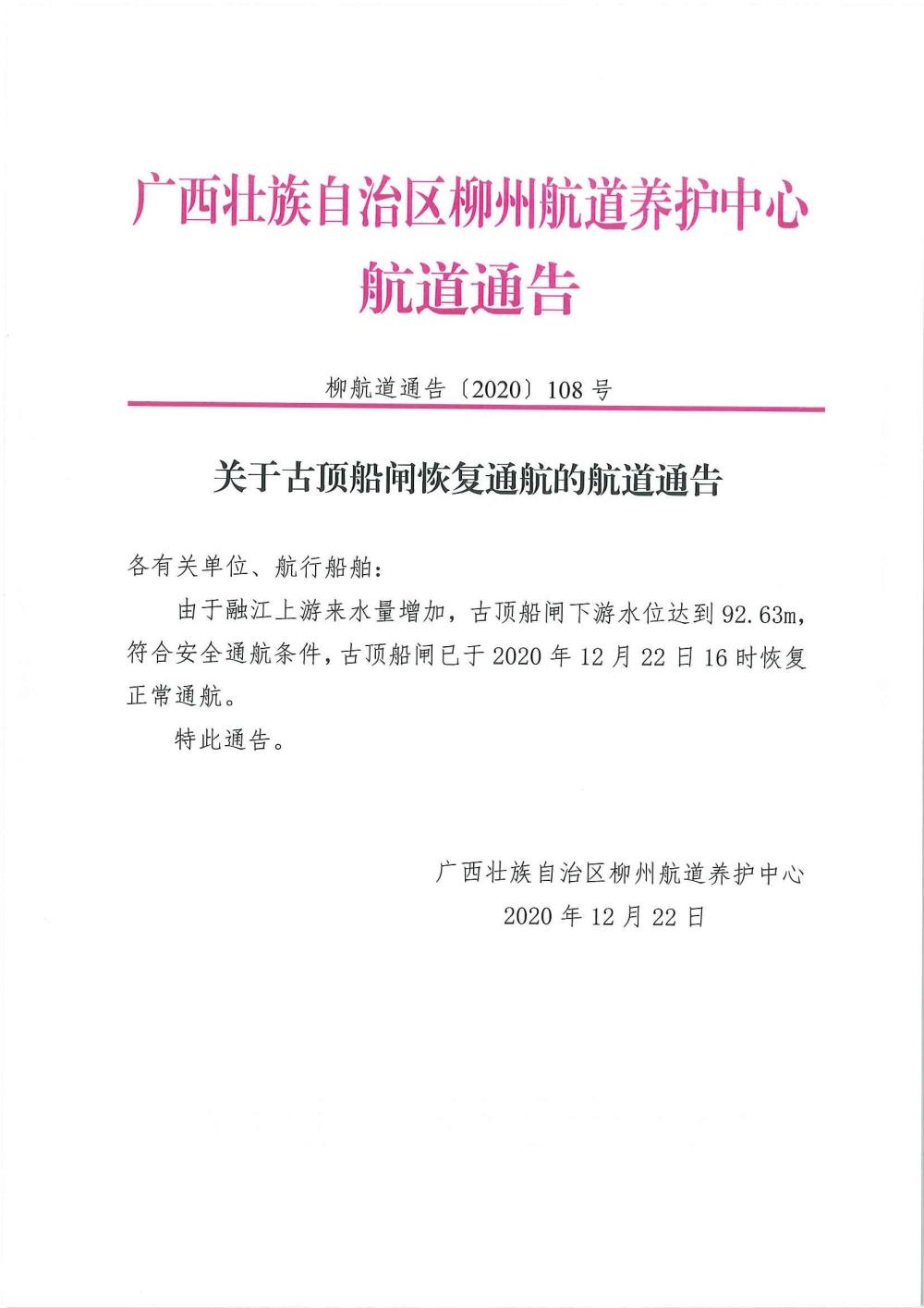 关于古顶船闸恢复通航的航道通告