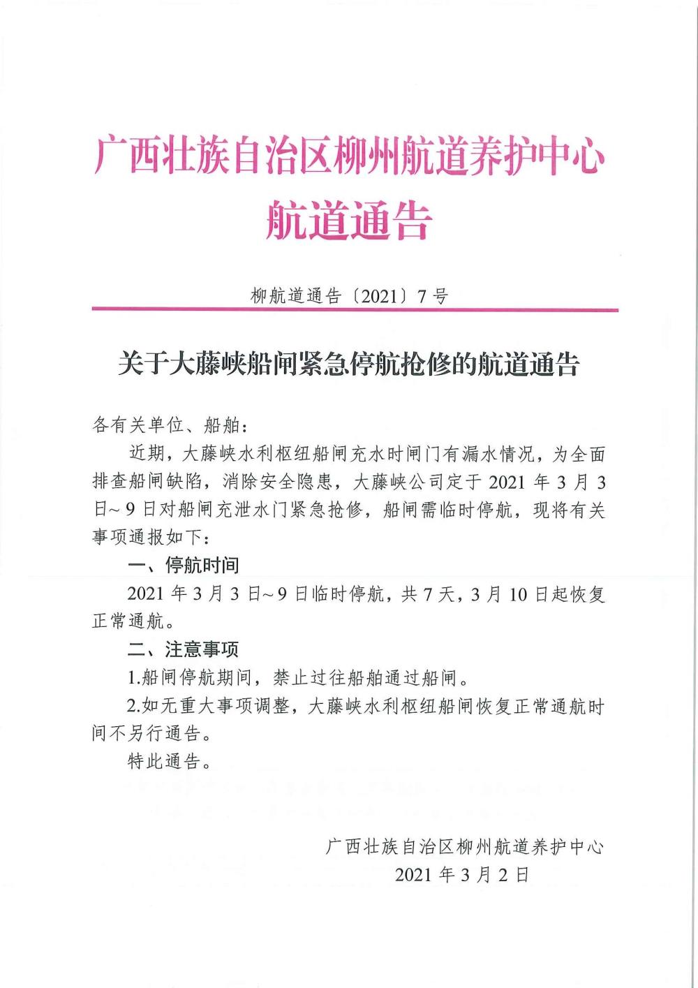 关于大藤峡水利枢纽船闸紧急停航抢修的航道通告