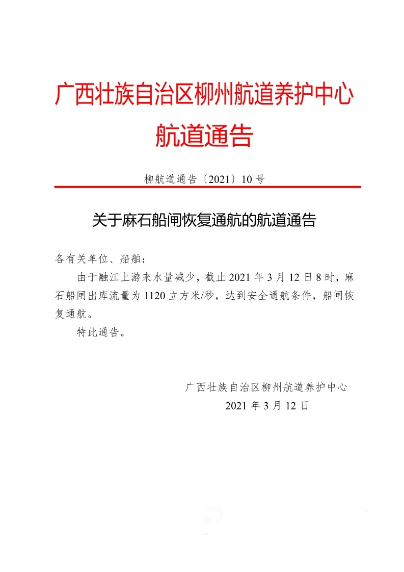 关于麻石船闸恢复通航的航道通告