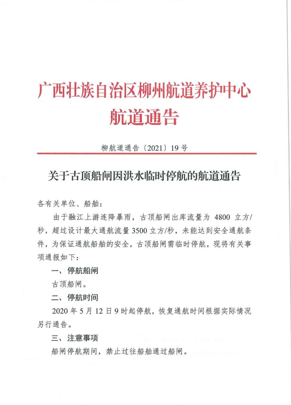 关于古顶船闸因洪水临时停航的航道通告