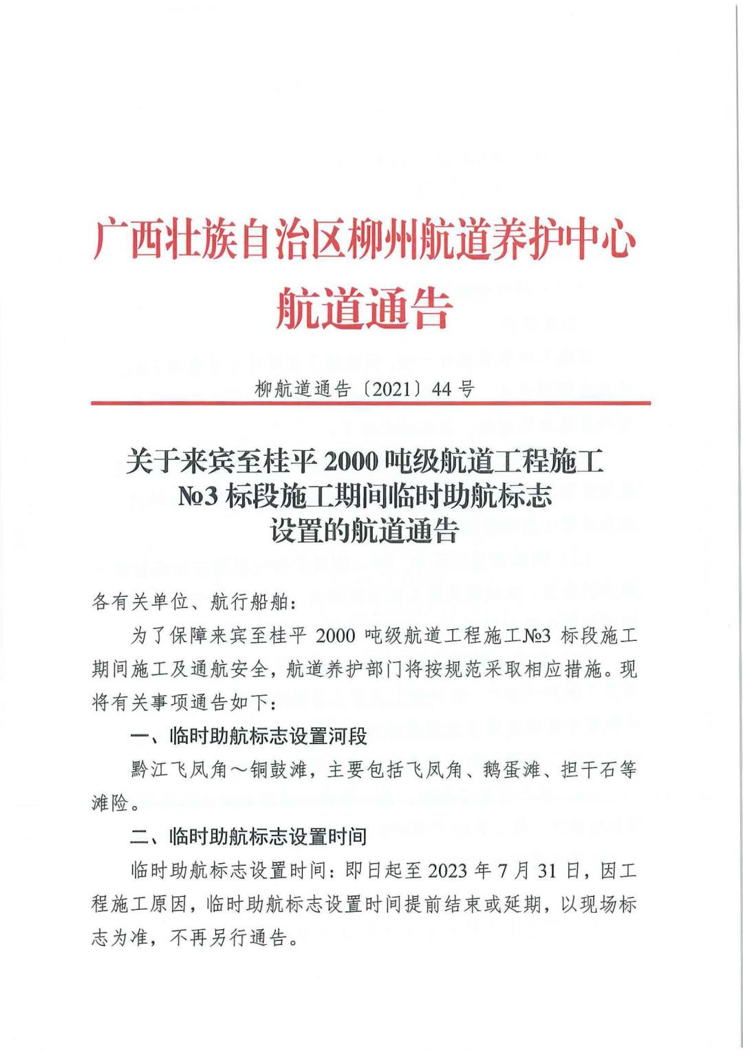 关于来宾至桂平2000吨级航道工程NO3标段施工期间专用标志设置的航道通告