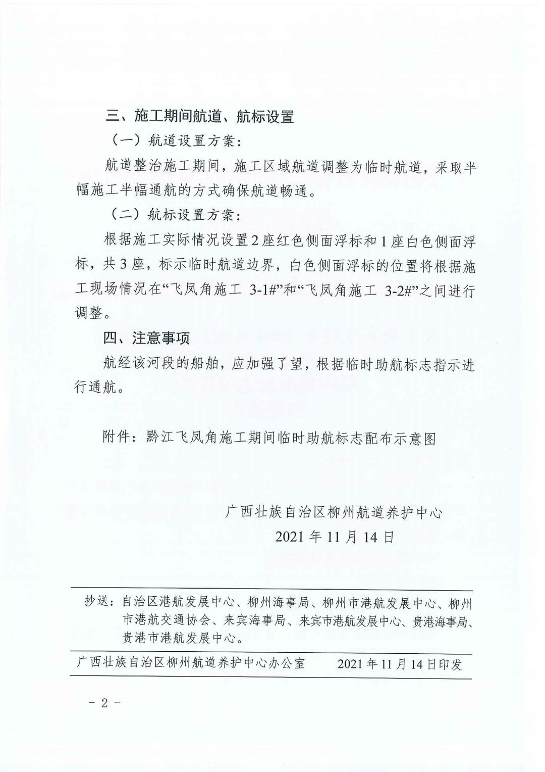 关于来宾至桂平2000吨级航道工程NO3标段飞凤角施工期间临时助航标志设置的航道通告