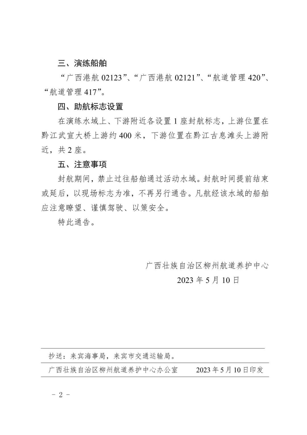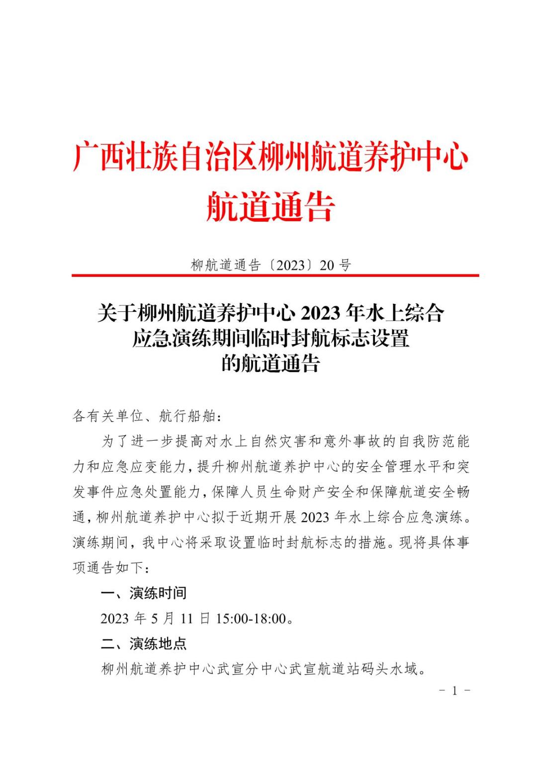 关于柳州航道养护中心2023年水上综合应急演练期间临时封航标志设置的航道通告