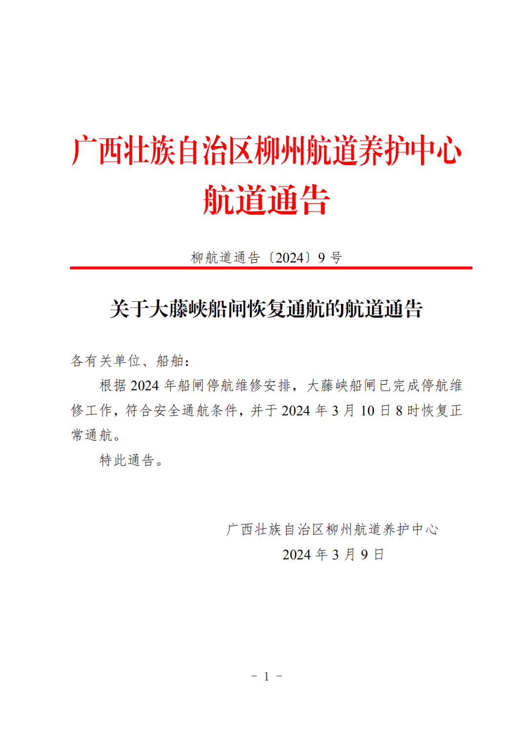 关于大藤峡船闸恢复通航的航道通告