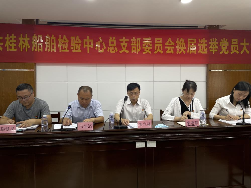 6月8日上午,桂林船舶检验中心组织召开党员大会选举新一届党总支委员会?;嵋橛筛弥行母笔榧翘扑厍嘀鞒?,自治区港航发展中心党委副书记、纪委书记韦立强,党委办公室(监察室)副主任李建慧莅临指导工作。 桂林船检党总支书记韦旭滔作了《贯彻新发展理念
