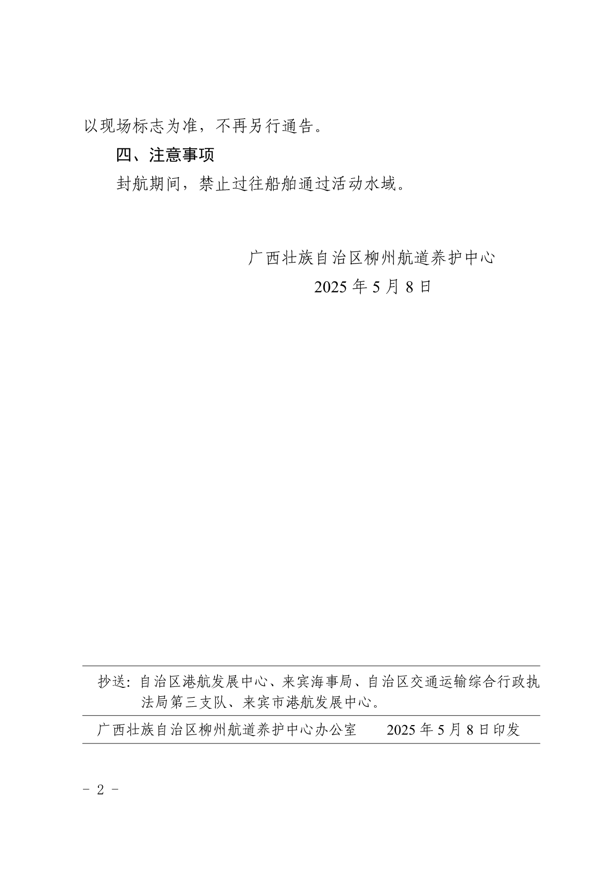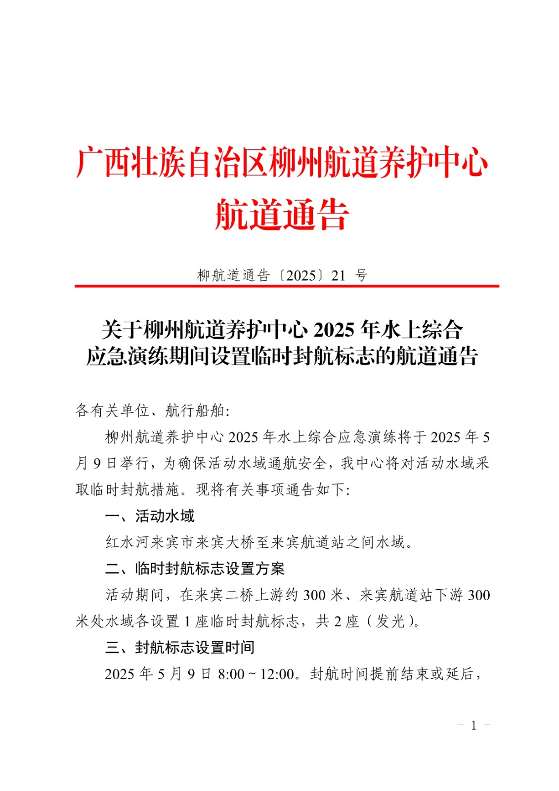 关于柳州航道养护中心2025年水上综合应急演练期间设置临时封航标志的航道通告