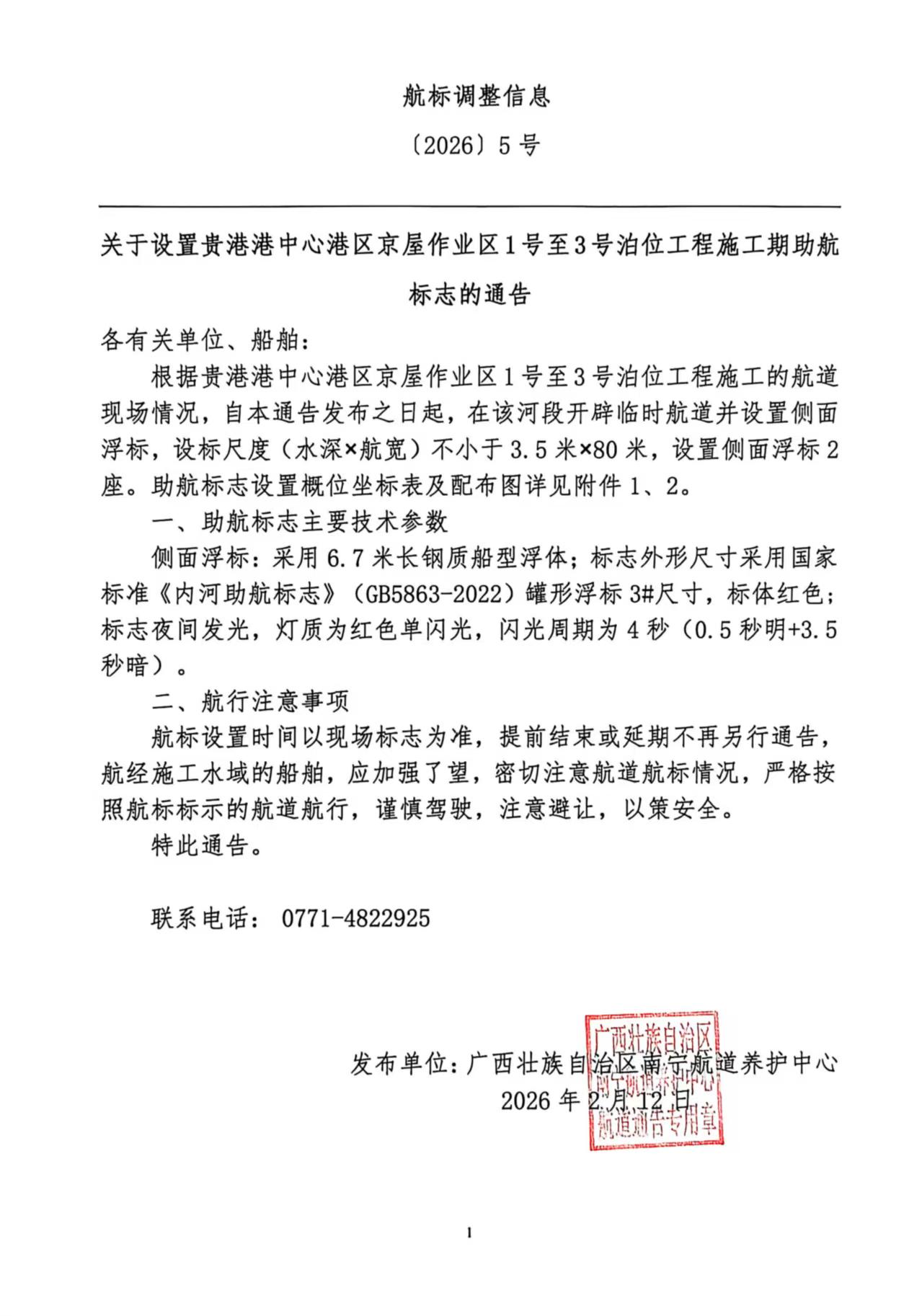 [2026]第5号航标调整信息(关于设置贵港港中心港区京屋作业区1号至3号泊位工程施工期助航标志的通告)
